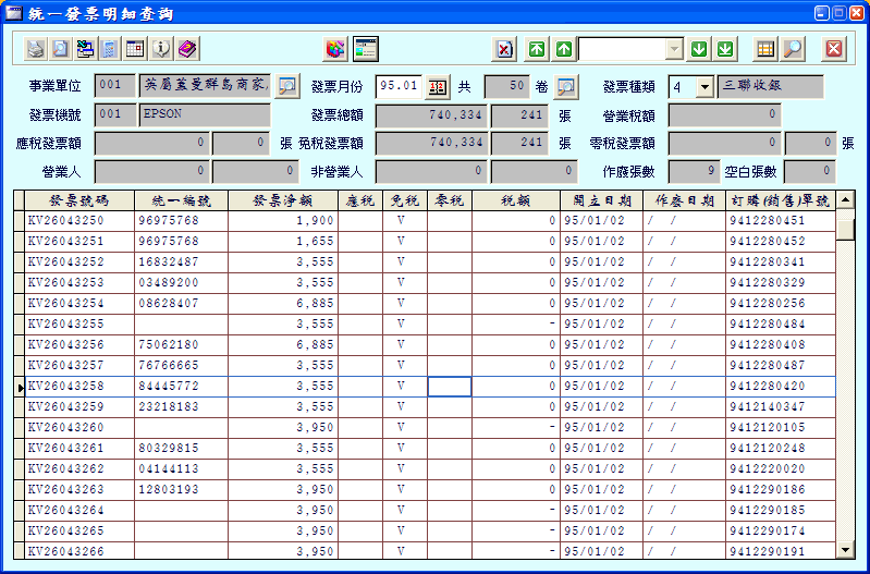 每次查詢明細時是以指定的發票月份、發票種類、每卷(本)為單位,詳列該卷每張開立資料及作廢日期。 |