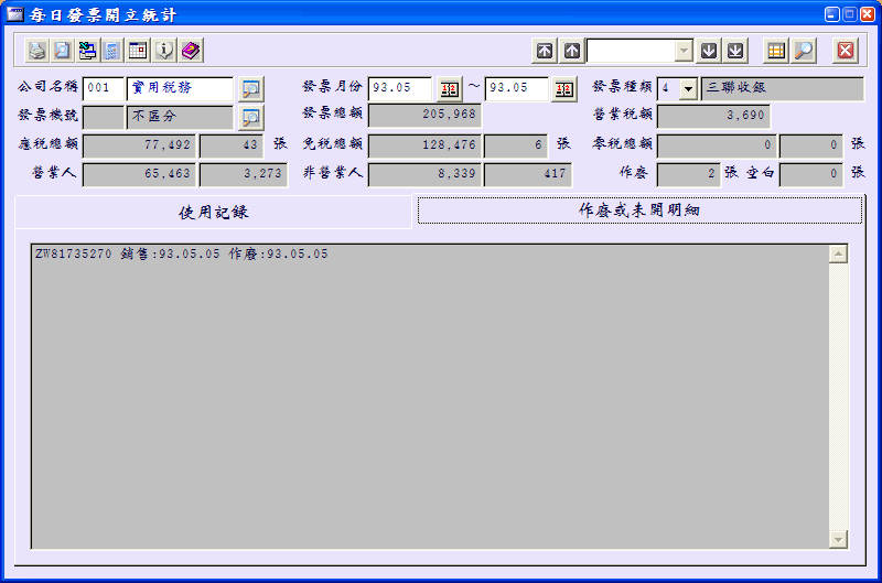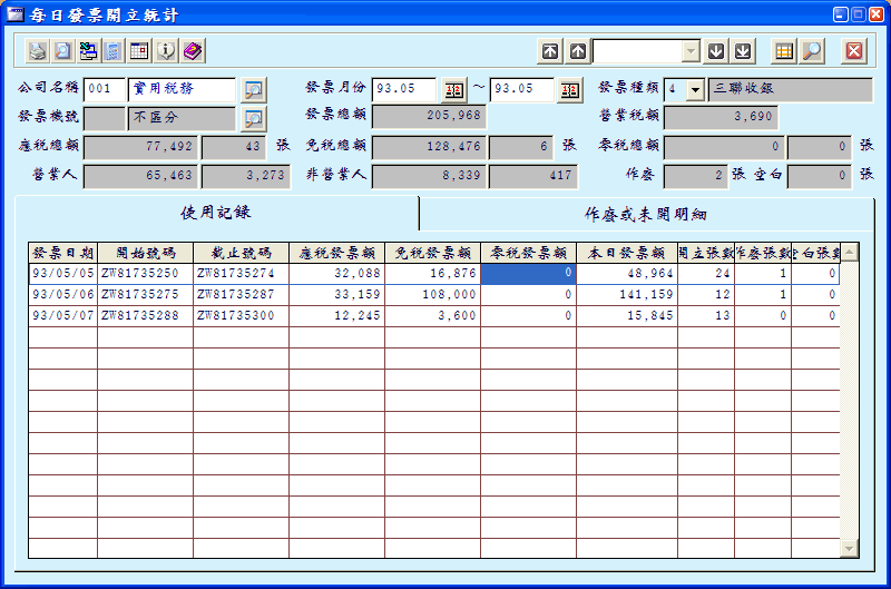 查詢明細時是以指定的發票公司、發票月份、發票種類為單位,算出每天發票開立、作廢、未開明細及累計金額。 |
