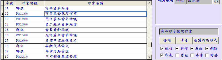 各作業皆需設定權限才能執行,請選取左方的作業後,在右方的權限欄位勾選權限項目。 |
